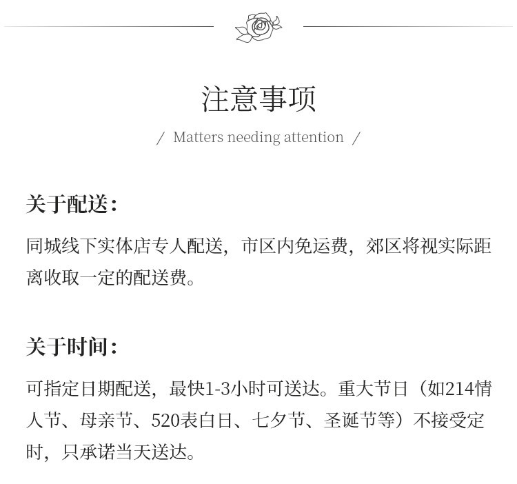 由于各地的花藝師不同,鮮花包扎可能在形式和搭配上與圖片不完全一致,但保證主花材的新鮮程度、數(shù)量、顏色與說明一致,謝謝您的理解。