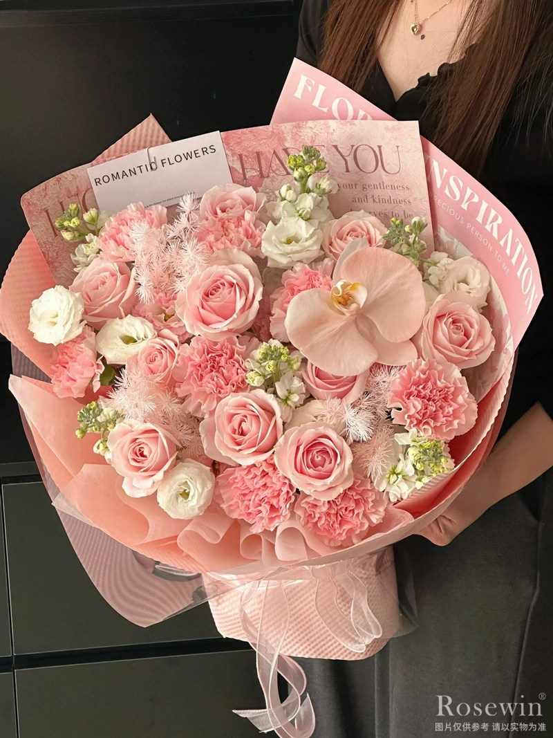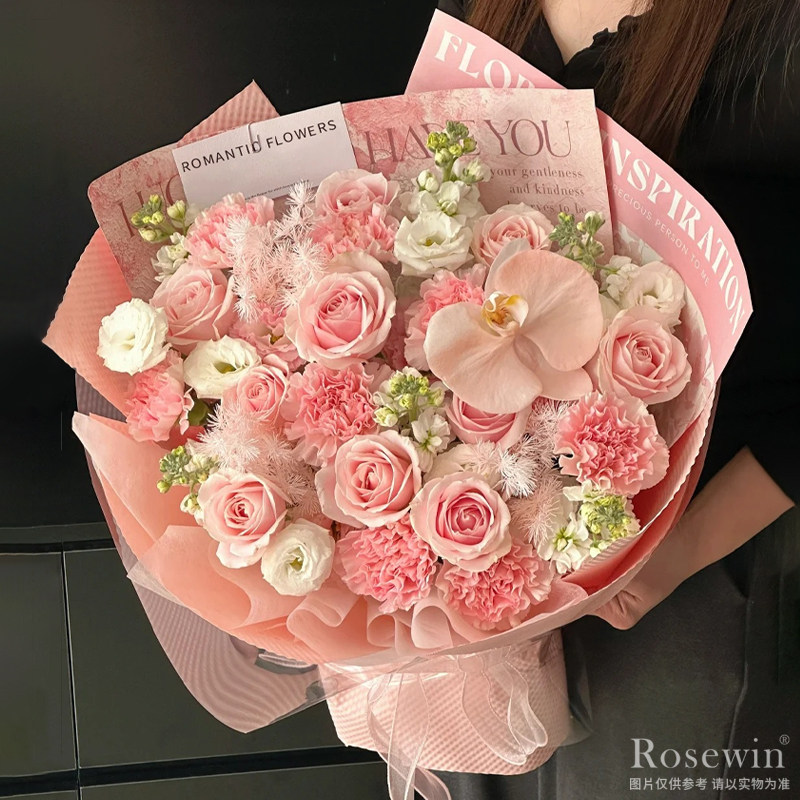 粉玫瑰,粉色康乃馨,洋桔梗,紫羅蘭等混搭